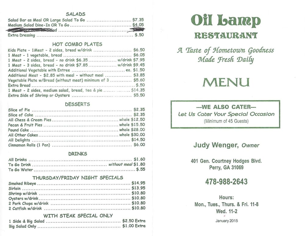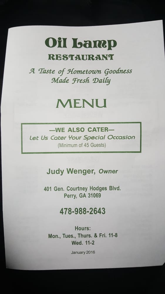 Welcome to Oil Lamp Restaurant, a hidden gem in Perry, GA, specializing in New American cuisine, delectable desserts, and refreshing salads. With a wide range of utilities such as takeout, reservations, delivery, and wheelchair accessibility, this restaurant caters to all diners. The cozy ambiance, outdoor seating, and friendly staff create a welcoming atmosphere for guests. From casual lunches to intimate dinners, Oil Lamp Restaurant offers a versatile dining experience. With a menu perfect for dessert lovers, salad enthusiasts, and those craving innovative New American dishes, there is something for everyone to enjoy. Whether you're looking for a quick bite or a leisurely meal, Oil Lamp Restaurant is sure to impress with its top-notch service and delectable dishes. Don't miss out on this culinary delight in Perry!
